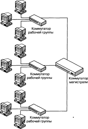 В небольших сетях, как правило, вместо коммутатора можно использовать концентратор. Чаще коммутаторы применяют в крупных интерсетях вместо мостов или маршрутизаторов. Если в обычной корпоративной сети, состоящей из магистрали и нескольких сегментов, заменить маршрутизаторы коммутаторами, эффект будет поразительный. В сети с маршрутизатором магистраль переносит межсетевой трафик, сгенерированный всеми сегментами. Это приводит к тому, что она всегда работает в условиях высокого трафика. В коммутируемой сети компьютеры подсоединены к отдельным коммутаторам рабочих групп, которые в свою очередь связаны с высокопроизводительным коммутатором магистрали (рис. 4). В результате любой компьютер сети может соединиться по выделенному каналу с любым другим компьютером, даже если данные проходят через несколько коммутаторов.