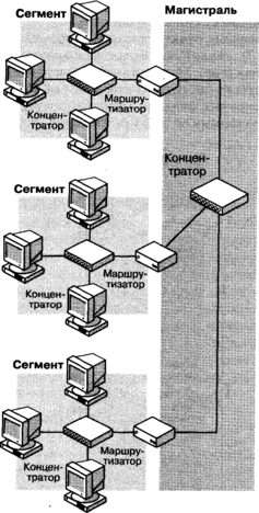 Существует много вариантов использования коммутаторов в сложных интерсетях; менять сразу все концентраторы и маршрутизаторы на коммутаторы не придется. Например, можно продолжать пользоваться обычными сетевыми концентраторами, но подключить их не к маршрутизатору, а к многопортовому коммутатору. От этого эффективность межсетевого трафика возрастет. С другой стороны, если в Вашей сети большой объем трафика генерируется внутри отдельных ЛВС, а не между ними, можно, не затрагивая магистраль, заменить коммутаторами концентраторы рабочих станций, увеличив тем самым доступную каждому компьютеру полосу пропускания.