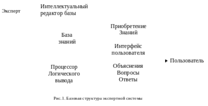 Для того чтобы пользователь мог эффективно взаимодействовать с экспертной системой, ее интерфейс должен выполнять две функции: давать советы и объяснения пользователю и управлять приобретением знаний. Взаимодействие эксперта, пользователя и структурных частей системы можно представить в виде следующей базовой структуры экспертной системы (рис.1).