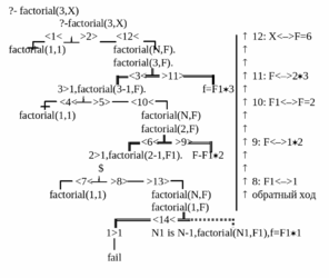 Будем обозначать в деревьях вывода двойной линией связь "и", одинарной - связь "или", стрелками с номерами - порядок унификаций, а перечеркиванием - неуспех унификации.