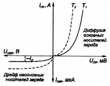 Вольтамперная характеристика p-n-перехода существенно зависит от температуры перехода. При увеличении температуры растет концентрация неосновных носителей и резко возрастает обратный ток перехода Io. В идеальных германиевых p-n-переходах при увеличении температуры на каждые 10оС обратный ток удваивается. И хотя в кремниевых переходах зависимость еще больше, но абсолютные значения Iо у кремниевых переходов значительно меньше.