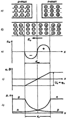 До установления термодинамического равновесия между p- и n-областями и в отсутствии внешнего электрического поля в таком переходе протекают следующие физические процессы. Поскольку концентрация дырок в p-области гораздо выше их концентрации в n-области, то дырки из p-области диффундируют в n-область.