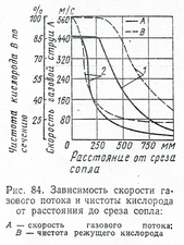 На рис. 4 видно, что при отсутствии подогревающего пламени (кривые 2) на расстоянии от сопла 600 мм скорость истечения струи падает до 40 м/с, а чистота кислорода до 25%. При наличии же мощного подогревающего пламени (кривые 1) на том же расстоянии от сопла скорость истечения струи составляет ~ 140 м/с, а чистота кислорода ~ 60%.