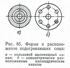 В отличие от сварочного пламени подогревающее пламя резака образуется на выходе горючей смеси из мундштука с кольцевым, щелевидным каналом — преимущественно у ручных резаков (рис. 5, а) или из многосоплового мундштука, имеющего несколько отдельных цилиндрических каналов, также расположенных по концентрической (по отношению к режущему соплу) окружности, — у большинства машинных резаков (рис. 5, б). Многосопловые мундштуки обеспечивают большую устойчивость пламени и более концентрированный нагрев металла.