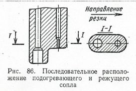 | При прямолинейной резке стали малой толщины (менее 5 мм) в некоторых случаях находят применение резаки с последовательным расположением сопл (рис. 6), при котором достигается нагрев металла узкой полосой, что особенно важно при резке тонкой стали, так как позволяет производить резку с малой шириной зоны теплового влияния и без оплавления кромок. |