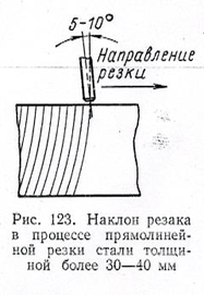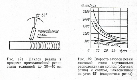 Положение резака в процессе резки. При прямолинейной резке стали толщиной до 30 мм режущее сопло резака целесообразно наклонять на угол 20—30° от вертикали в сторону, обратную направлению резки (рис. 121). В этом случае направленная под углом кислородная струя частично или полностью смывает с передней грани разреза образующиеся при окислении стали жидкие шлаки, ускоряет окисление металла и существенно увеличивает скорость резки, а следовательно, и ее производительность.