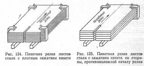 Сущность процесса газовой пакетной резки состоит в том, что разрезаемые листы, число которых при малой толщине металла может составлять 25 - 50 шт. и более, собирают в пакет, стягиваемый струбцинами или специальным зажимным приспособлением, и разрезают за один проход резака (рис. 124).