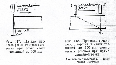 При резке стали толщиной до 30 мм мундштук резака в начале процесса резки может быть установлен вертикально или с небольшим наклоном на угол 5-10° в сторону, обратную направлению резки. При резке стали сравнительно большой толщины (до 100 мм) мундштук резака в начале процесса устанавливают под углом 10-15° (рис. 117).