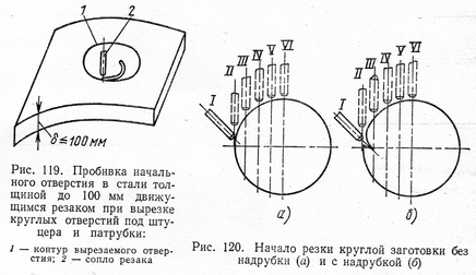 Иногда начальное отверстие внутри контура листа образуют движущимся резаком. В этом случае кислородная струя, врезаясь постепенно в металл (рис. 118), после перемещения резака на некоторое расстояние пробивает сквозное отверстие. Этот способ начала резки получил распространение в котлостроении при вырезке отверстий под штуцеры и патрубки, когда процесс резки начинают внутри контура вырезаемого отверстия (рис. 119). Шлаки, образующиеся при прожигании отверстия движущимся резаком, давлением кислородной струи выносятся назад за струю, благодаря чему устраняется засорение мундштука брызгами металла и шлака.