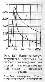 Термический цикл процесса резки низколегированной стали толщиной 5 мм с сопутствующим подогревом кольцевой шестисоп-ловой горелкой для точки, отстоящей от кромки реза на расстоянии 0,5 мм (рис. 129), характеризуется скоростью охлаждения металла в субкритическом интервале температур около 4,5° С в секунду, т. е. примерно в 8 раз меньшей, чем при резке без подогрева. Если сопутствующий подогрев в процессе резки существенно снижает твердость стали в зоне теплового влияния, способствуя хорошей обрабатываемости кромок, и устраняет возможность образования трещин в зоне теплового влияния, его необходимо применять. Однако в связи с тем, что сопутствующий подогрев связан с излишним расходом газов (расход ацетилена возрастает на 600 - 1000 л/ч), рекомендовать его следует только в случае выполнения резки исключительно ответственных изделий, когда недопустима закалка кромок.