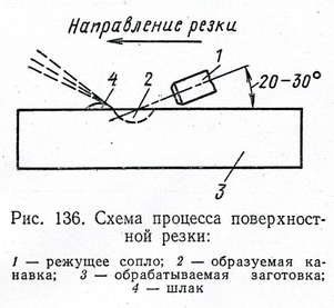 Сущность процесса. При поверхностной кислородной резке струя кислорода направлена на поверхность металла под острым углом, составляющим 20-30° к поверхности металла (рис. 136). Как процесс разделительной резки, поверхностная резка протекает при наличии подогревающего пламени резака, нагревающего металл в начале и в процессе резки.