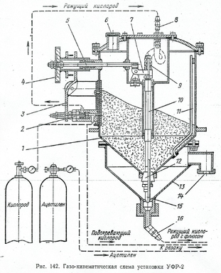 Бункер флюсопитателя состоит из корпуса 1 с конической камерой 13. Крышка бункера прикреплена к корпусу герметичным фланцевым соединением. До начала работы выход порошка перекрыт конусным клапаном 12, а кислород - вентилем 2. Кислородно-флюсовую струю пускают вращением маховичка 4 по часовой стрелке. Маховичок толкает тягу 5 и через рычаг 7 сообщает вертикальное перемещение тяге 10 порошкового клапана 12, в результате чего последний опускается вниз и открывает выход порошка в камеру 13. В то же время маховичок 4 нажимает на рычаг 3, открывающий кислородный вентиль 2. В результате кислород через ниппели 8 и 9 поступает к соплу инжектора 15, на выходе из которого он, создавая необходимое разрежение, увлекает порошок через ниппель 16 в режущее сопло резака.