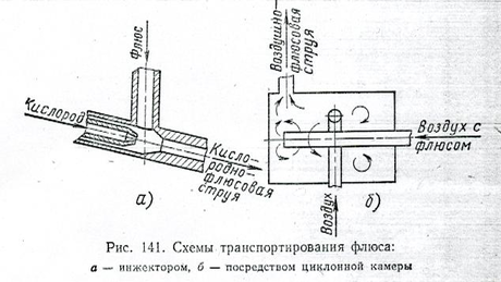 Инжекторные конструкции флюсопитателей применяют для резки с применением крупного или среднего железного порошка, когда за счет инжекции возможна устойчивая подача порошка по шлангам в резак (рис. 141, а). Мелкие и тем более очень мелкие порошки в связи с потерей, в известной мере, сыпучести инжектируются плохо и для их транспортировки необходимо предварительное взмучивание (взвешивание) частиц в специальной циклонной камере с последующим их выносом по шлангу в резак струей сжатого воздуха или азота.