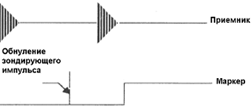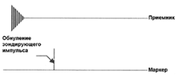 Логическая цепь прибора отслеживает временной интервал появления эхосигналов от противоположной стенки емкости. Если в этом временном интервале появляются эхосигналы, зажигается световой индикатор наличия жидкости. Отсутствие эхосигналов в этом интервале свидетельствует об отсутствии жидкости в контрольной точке. В этом случае зажигается световой индикатор отсутствия жидкости.