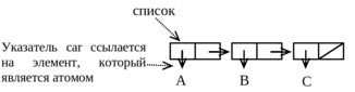 Из рисунка следует, что логически идентичные атомы содержатся в системе один раз, а логически идентичные списки могут быть представлены различными списочными ячейками. Например, значение вызовов