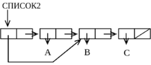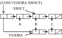 В приведенном примере функция cons не изменило структуры списков, являющихся аргументами, и не изменило значения переменных ГОЛОВА и ХВОСТ. Кроме того, из примера следует, что на одну списочную структуру может ссылаться несколько указателей. Но из каждого поля ячейки может исходить лишь один указатель. Если на какую-то ячейку есть несколько указателей, то эта ячейка будет описывать общее подвыражение. Например, в списке (кто-то приходит кто-то уходит) символ кто-то является общим подвыражением, на которые ссылаются указатели из поля CAR первой и третьей ячеек списка.