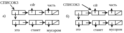 CAR-часть как бы отделяется, поскольку указатель из атома СПИСОК3 ссылается на cdr-часть исходного списка. Теперь нельзя через символы и указатели добраться до четырех ячеек. Эти ячейки стали мусором.