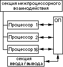 ray C90 (эталон построения векторных с-м) выпускалась на рубеже 80х – 90х годов. Все процессоры объединяются ОП. Секция ввода/вывода отвечает за взаимодействие с внешними устройствами. Память делят на отдельные секции и отдельные банки. В ОП всего выделяют 1024 банка и последовательные слова размещают по банкам с чередованием банков. При считывании возможно обращение к банкам т.е. ко второй, до завершения работы с первой. Данный процесс приводит к ускорению ОП. Все взаимодействия с данными замыкается на ОП. Все взаимодействия с командами замыкается на секции процессорного взаимодействия.