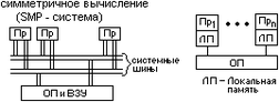 меют строго общую память и строго общие шины. Все обмены между процессорами идут через память SMP (Segmenting Multi Processor) – с-мы с единым доступом к памяти (UMA – Unifom Memory Access).