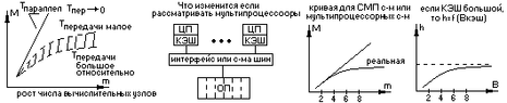(1-h) – вероятность того, что l в КЭШ памяти; V – общее число операций в задании; P – доля операций выполняемых последовательно; q – число тактов среднее на выполнение 1-ой операции; Тц – длительность такта процесса; С – среднее число обращений в память на одну операцию; Ткэш – время обращения в КЭШ память; h – частота попадания в КЭШ при обращении в память.