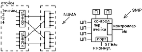 ример CC-NUMA с-мы. На примере серверов разработки HP Superdome (HPS). Выполняется на процессорах РА-8600 (HP - разработчик). Рабочая частота ~ 1ГГц и имеет 2-64 процессоров и 256 Гб памяти со связной адресацией. С-ма в max варианте комплектуется в 2 стойки, в каждой стойке 2 коммутатора. К портам коммутатора по 4 ячейки. Каждая ячейка – 4 процессора и 2 модуля памяти, которые объединяются контроллерами ячейки, который имеет 2 порта (1 – коммутаторный, 2 – к контроллеру в/в, т.е. прежде всего на дисковую с-му). Общей памяти нет, т.к. память имеет сквозную адресацию.