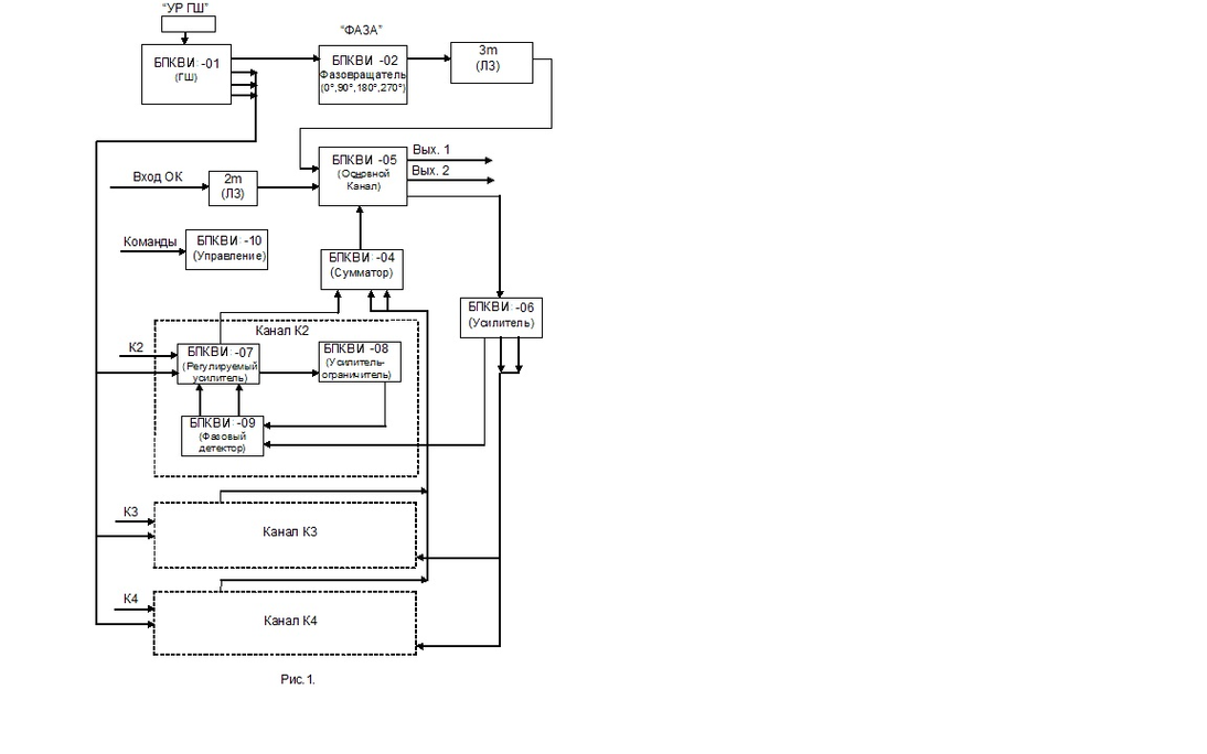 игнал помехи каждого КК поступает на вход соответствующей ячейки регулируемого усилителя (РУ) [ячейка БПКВИ -07], которая изменяет амплитуду и фазу входного сигнала управляющими напряжениями, вырабатываемыми в соответствующих цепях корреляционной обратной связи (КОС) [ячейки БПКВИ Е-06, Б БПКВИ -08, БПКВИ -09]. Подключение соответствующего КК к защищаемому каналу происходит по командам