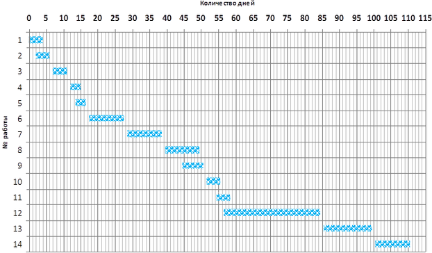 Ниже приведён календарный график длительности работ, представляющий из себя диаграмму Ганта, который наглядно иллюстрирует какие работы могут выполняться параллельно и последовательно-параллельно.