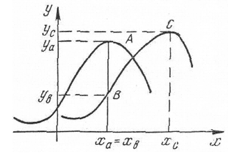 Допустим, что в некоторый момент времени рабочая точка объекта А (рисунок 1.4) определялась координатами ха,уа и находилась в экстремуме. Возмущающие воздействия скачком сместили экстремальную характеристику в новое положение. В результате состояние объекта характеризуется точкой В с координатами хв,ув .Точка В находится между двумя экстремумами. При случайном выборе направления она может прийти в минимум или в максимум. И то и другое положение соответствует экстремальному значению функции.