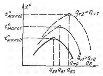 Во многих видах производства в качестве теплоносителя используется тепло газов, получаемых в результате сжигания в топочных устройствах того или иного вида топлива. Статическая характеристика топочного устройства по каналу «расход воздуха на горение - температура топочных газов» имеет экстремальный характер: максимальная температура топочных газов t◦макс получается для данного количества сжигаемого топлива QT при вполне определенном количестве подаваемого в топку воздуха Qв (рисунок 1.5).