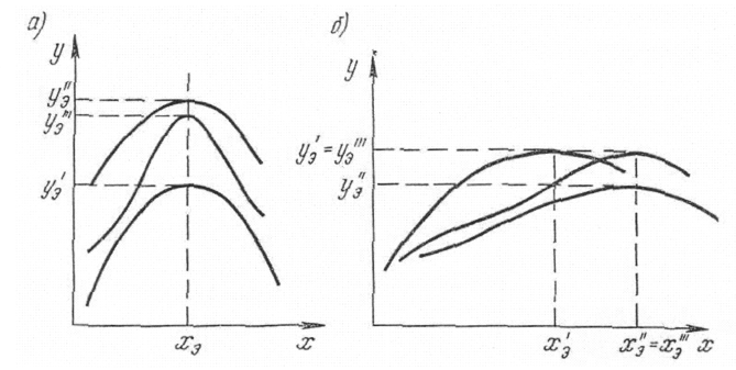 Для простоты рассмотрим не экстремальную поверхность, а экстремальную линию (рисунок 1.3). Под действием различных возмущающих воздействий экстремальная линия может смещаться или, как принято говорить, дрейфовать. При этом возможны два случая: экстремум дрейфует по вертикали с искажением или без искажения формы (рисунок 1.3 - а), экстремум смещается и по вертикали, и по горизонтали (рисунок 1.3 - б).