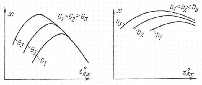 На рисунке 1.9 показаны статические характеристики слоя катализатора в координатах «температура газа, входящего в слой t◦вх, - степень контактирования х в слое». На рисунке 1.9-а характеристики показаны при различных расходах газа G1,G2,G3 через слои катализатора; на рисунке 1.9-б при различной концентрации