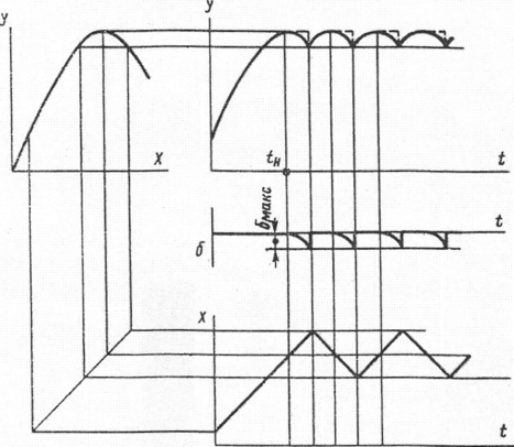 Во втором варианте скорость изменения входной величины не сохраняется постоянной. В этом случае при нелинейной статической характеристике объекта y=f(x) скорость движения исполнительного органа устанавливается пропорциональной отношению скорости выхода к скорости входа.