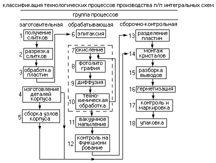 В зависимости от структуры ИС и конструкции корпуса общие количество операций может достичь 200. По своему назначению и месту занимаемому в общем процессе производства ИС, все операции разделяются на три группы.