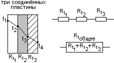Три твёрдых пластины соединены между собой. Кондуктивная передачи тепла. Для каждой из зон будет характерна RT1, RT2, RT3. В электрическом виде смотри рисунок.