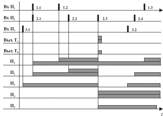 Динамика работы перехода иллюстрируется на рис.6, г и 7, где показано: б, г — переход с тремя входными и двумя выходными позициями и с кратными дугами (два пунктирных эллипса с числовым указанием кратности), рис.7 — временная диаграмма работы перехода при заданной последовательности поступления маркеров и соответствующие изменения количества маркеров в позиции.