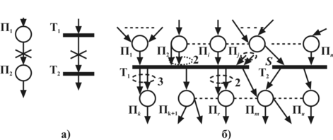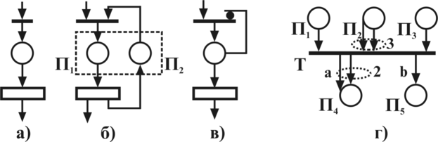 Логическое условие срабатывания перехода — для срабатывания перехода из каждой позиции, связанной выходящей(ими) дугой(ами) со входом(ами) рассматриваемого перехода должно находиться количество маркеров (М), не меньшее кратности К (см. рис. 5,б).