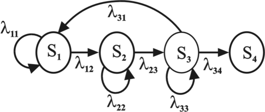 Предположим, что нам известны плотности вероятностей переходов для всех пар состояний системы, граф переходов которой показан на рис. 10.