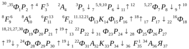 В этой записи использован следующий принцип обозначений. Если порядок следования операторов отличается от естественного (заданного последовательными номерами), то номера входных операторов указаны вверху слева от символа; номера операторов, к которым следует переход, — вверху справа от символа; на стрелке, идущей вверх от оператора условного перехода, указан номер оператора, которому передается управление при выполнении условия; на стрелке вниз — в противном случае.