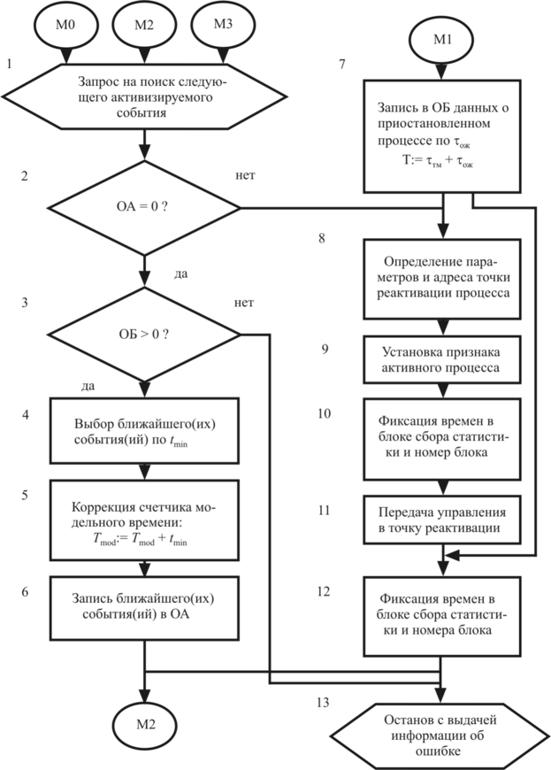 Блок 1 анализирует списки будущих и активизированных — (т.е. активных в модельном времени, но ожидающих в машинном времени) событий и имеющихся для определения процесса, подлежащего активизации в момент машинного времени; прерывает и возобновляет работу процессов; передает информацию об изменениях состояний в блок сбора статистики 10; формирует информацию для сообщений об ошибках (блок 9).
