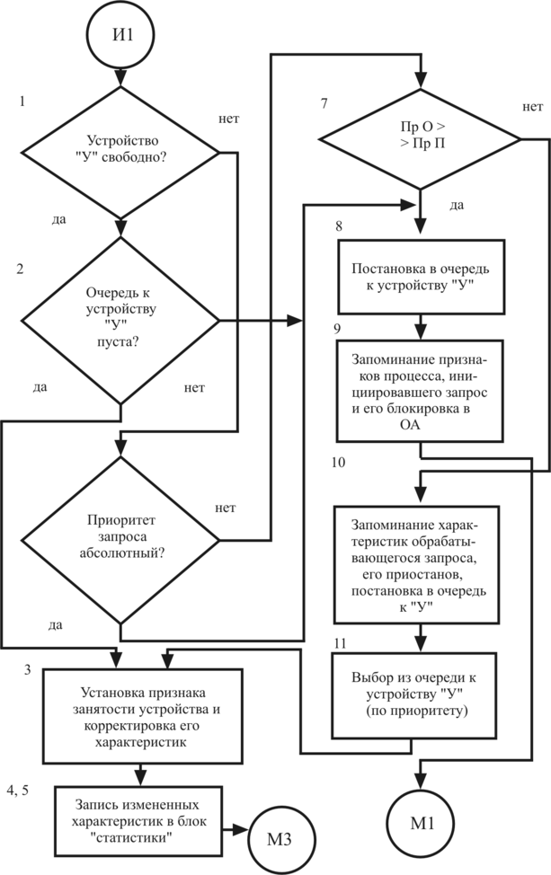 Блоки 3 и 4 ставят признаки занятости устройства «У», корректируют статистику по устройству и возвращают управление в ММ блок 1 (см. рис.12а)