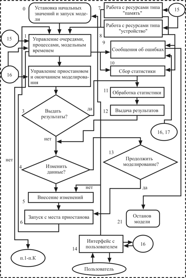 Программы разных типов инициируются соответствующими типами операторов имитационных моделей. Блоки 19 и 20 условно представляют модели процессов п. 1 — п. К, совокупность которых является моделью объекта (см. рис.126, внизу).