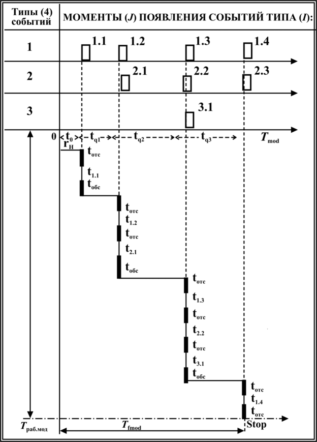 На диаграмме приведен пример с присутствием в модели трех типов событий (i=1,3). Моменты появления события отображаются в верхних трех строках прямоугольниками с двумя индексами i и j.