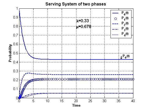 Рассмотрим моделирование двухфазной системы массового обслуживания в программных средах MATLAB и GPSS/PC. Сначала смоделируем двухфазную систему в системе MATLAB. Примем, что параметр входного простейшего потока равен 0.33, а интенсивность обслуживания каждой фазы равна 0.678, т.е. =0.33, =0.678. В основе моделирования стоит задача интегрирования системы дифференциальных уравнений вида (1.2) на отрезке времени, когда вероятности состояний примут свои установившиеся значения. По установившимся значениям вероятностей будут рассчитаны операционные характеристики системы. Входными данными программы, таким образом, будут являться интенсивности входного потока и обслуживания, а также матрица коэффициентов системы дифференциальных уравнений.