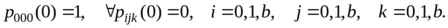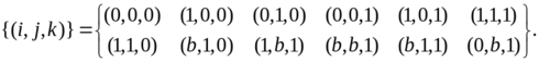 В трехфазной системе каждая из фаз может быть свободной (символ 0), занятой (символ 1), а фазы 1 и 2 могут быть к тому же заблокированы (символ b). Если состояние первой фазы обозначить символом i, состояние второй фазы — символом j, состояние третьей фазы — символом k, то возможные состояния трехфазной системы будут следующими: