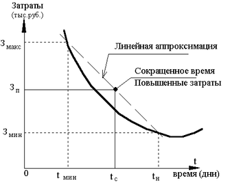 Прямая задача: при найденном критическом пути использовать резервы некритических работ и получить сеть с минимальными затратами на весь комплекс работ. Можно поставить и обратную задачу: за счет увеличения затрат на работы критического пути сократить сроки выполнения работ этого пути, а значит, и сроки выполнения всего комплекса работ.