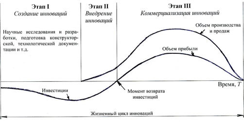 Инновационный процесс можно рассматривать как следующие временные этапы жизненного цикла инноваций: (1) создание технических инноваций; (2) внедрение технических инноваций; (3) коммерциализация технических инноваций. Процессом коммерциализации принято называть процесс введения новшества на рынок. Суммарная длительность всех трех фаз инновационного процесса называется жизненным циклом инноваций.
