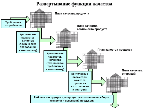 Сопоставляя потребительские и технические характеристики изделия между собой, можно обнаружить случаи как независимости, так положительной или отрицательной корреляции. Метод развертывания функции качества (РФК) разработан в Японии еще в 1966 году. Это эффективная форма анализа зависимостей между потребительскими и техническими характеристиками. Одной из первых его применила Mitsubishi на строительной верфи в Кобэ. Впоследствии этот метод получил широкое распространение в корпорации Ford, в которой развертывание функции качества определяют следующим образом: «Средство планирования для перевода характеристик качества, которые требует покупатель (т.е. его желания, потребности, ожидания), в подходящие черты изделия».