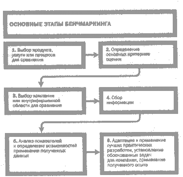 (г) функциональный бенчмаркинг – сравнение отдельных функций, процессов (продажи, закупки и т.д.) или подразделений фирмы с аналогичными параметрами фирм-лидеров (речь идет о том, чтобы искать лучшие образцы везде, где они встречаются). Например, компания Marriott применила бенчмаркинг, позаимствовав у компаний быстрого питания процессы найма, обучения и оплаты труда работников.