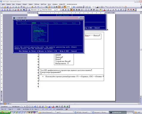 Далее, последовательно выбирая все пункты в каждом разделе основного меню, входя при этом и в подпункты, предусмотренные тестом, ознакомьтесь с полным набором предлагаемых действий и проверок. При этом фиксируйте в сокращенном табличном виде все выводимые тестом перечни проверок. В результате должен быть зафиксирован полный перечень проверок, предусмотренных «Checkit». Обратите внимание на пункт "Назначение" основного меню, в котором предусмотрено задание порядка ведения протокола работы в Checkit.