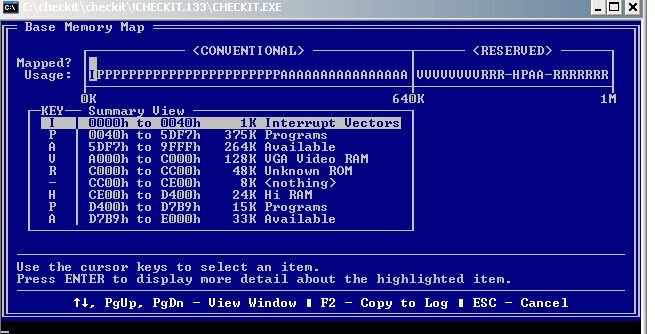 Первый мегабайт памяти включает стандартную оперативную память (первые 640 Кбайт) и зарезервированную память (от 640 Кбайт до 1 Мбайт). Стандартная оперативная память представлена прямоугольником "CONVENTIONAL", а зарезервированная - "RESERVED". Память разбита на отдельные участки, в зависимости от режима их использования. Каждый участок представлен различными символами, по которым можно определить, для чего он используется. В таблице, расположенной ниже мы объясняем смысл этих символов.
